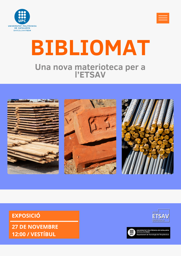 El passat 27 de novembre de 2025, a les 12.00 h, es va inaugurar al hall de l'ETSAV, a Sant Cugat del Vallès. L'exposició del projecte BIBLIOMAT, dins del marc de EDC (Espai Docent Comú). L'acte va reunir membres de la comunitat universitària interessats en la innovació docent i en l'aprenentatge dels materials de l'arquitectura.