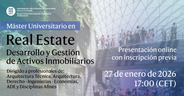 El proper dimarts 27 de gener, a les 17:30 CET, tindrà lloc una sessió informativa de la tercera edició del Màster Universitari en Desenvolupament i Gestió d'Actius Immobiliaris (MUDGI).