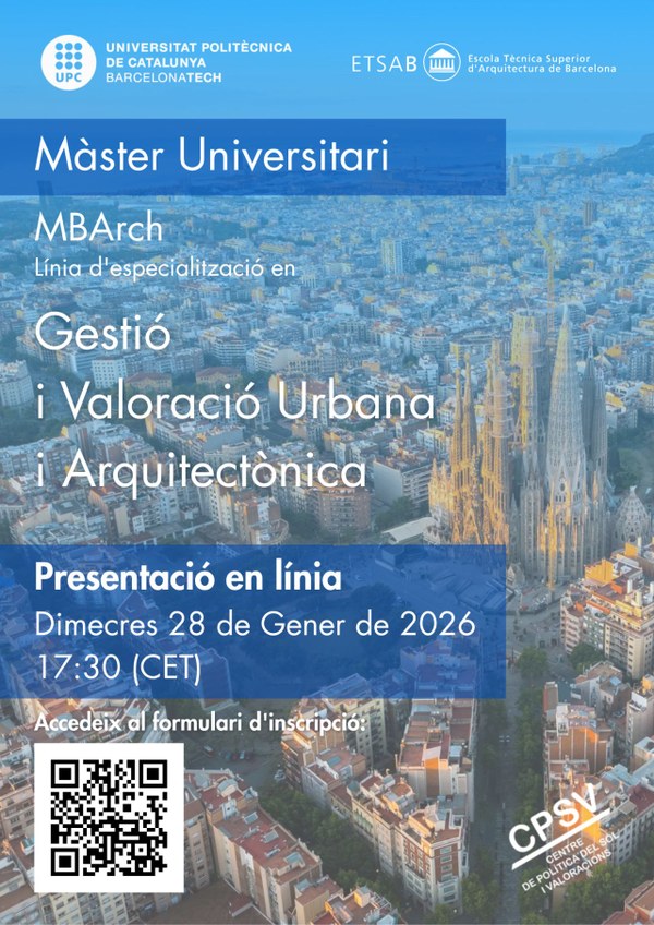 Con inicio del nuevo año, es un buen momento para plantearse nuevos retos académicos y profesionales. Si estás considerando cursar un máster, te invitamos a participar en la sesión informativa de la edición 2026-2027 de la línia de Gestión y Valoración Urbana y Arquitectónica (GVUA) del MBArch ETSAB.